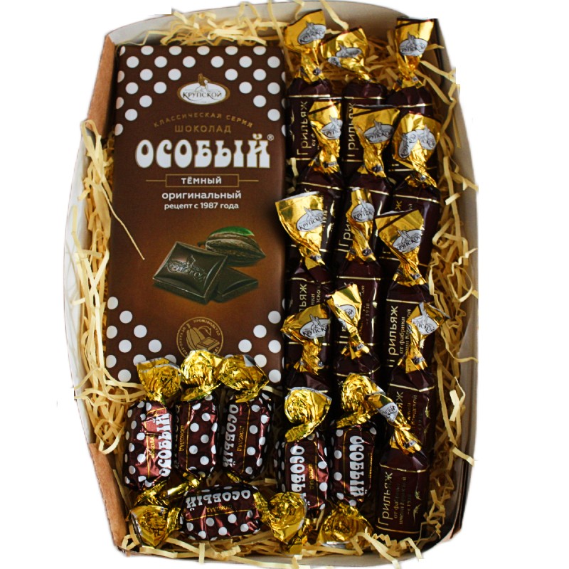 Подарочный набор шоколада от фабрики "Крупская": плитка шоколада "Особый" весом 90 грамм шоколад "Особый" в виде конфет - 10 шт грильяж в шоколаде в виде конфет - 10 шт